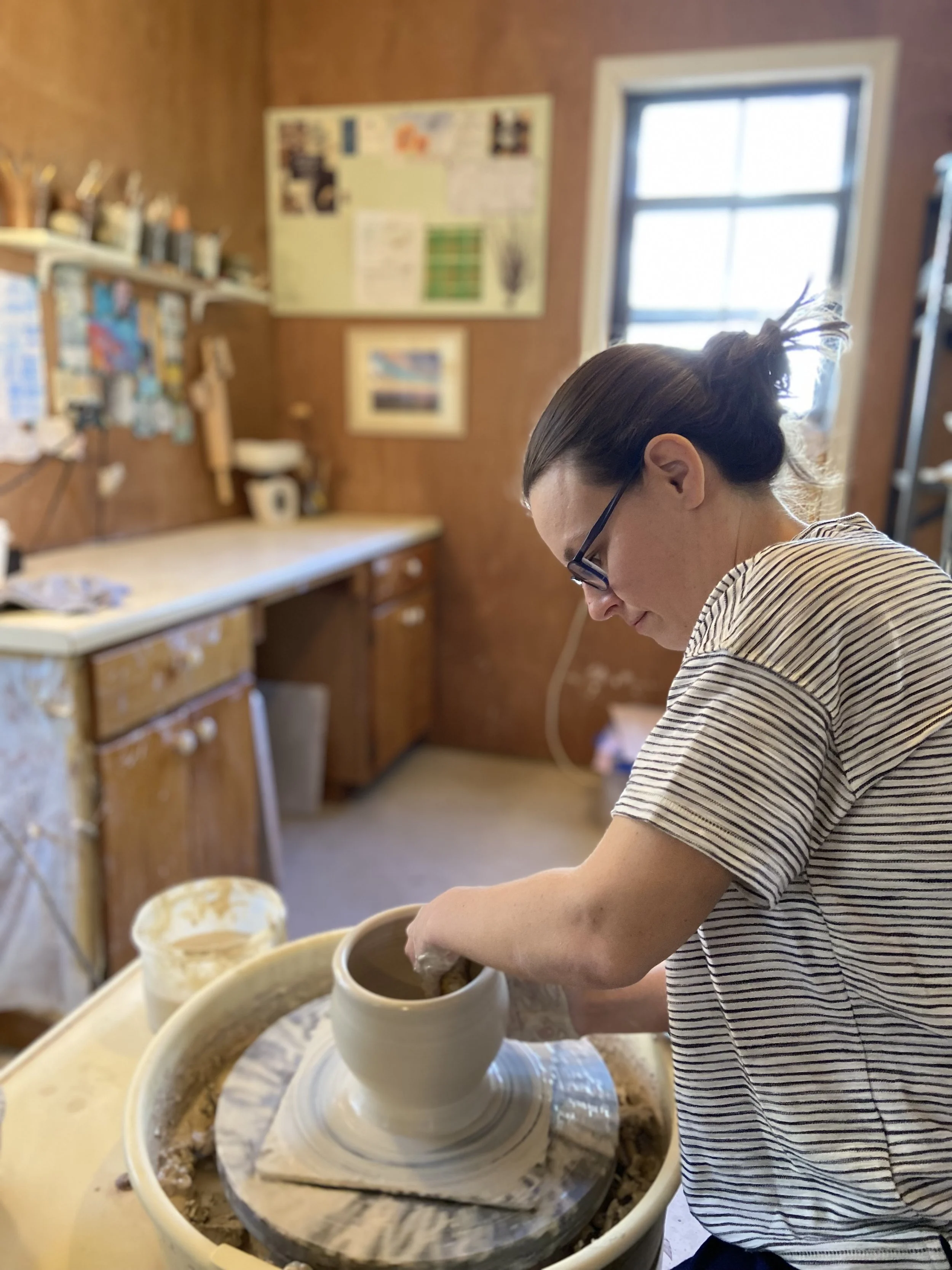 I began my journey in clay as a barefoot girl who found clay in a dirt pile during a home reconstruction project. I made all sorts of things out of modeling and oven baked clay- even a claymation when I was about 10! I think I fell in love with clay before I even took my first class in 2014. But once I had my first taste of working on the pottery wheel I was done for. I continued taking classes, and a year later became a studio at the place I took my first class- the Village Potters in Asheville, NC aka the most magical place on earth. In 2016 I joined the inaugural cohort of students in the Village Potters Independent Study and Mentoring program. I learned so much in these first years in clay- not only how to make things but how to load a kiln, different firing techniques, glaze chemistry, how to think about the business side of things, how to market and sell work. Mostly I learned there the incredible value of creating work alongside other creators. Potters are the best people and I loved my time in this community studio!